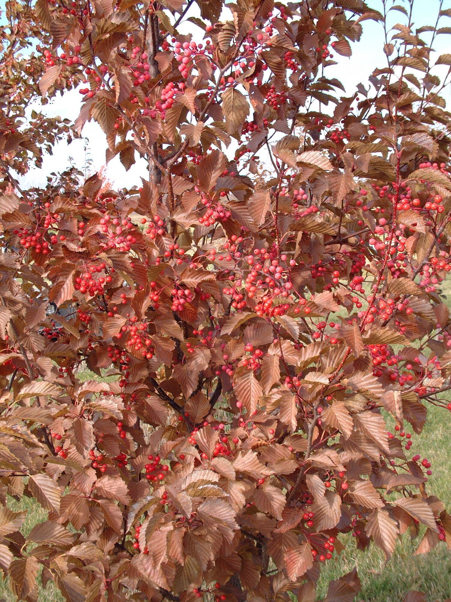 - SORBUS ALNIFOLIA KOREAN; White Flowers, Tiny Red Fruit; Burgundy Fall Colour)